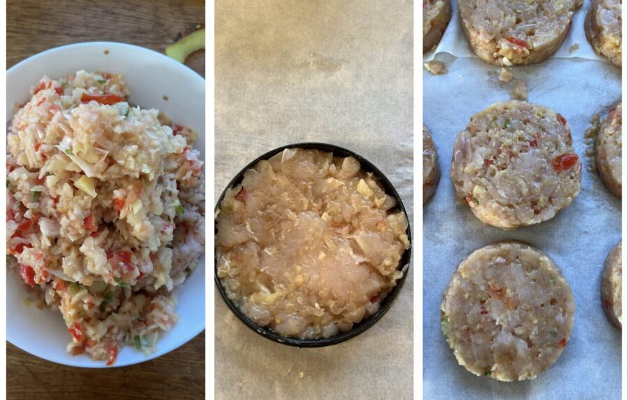 assaisonnez avec de la sauce soja ou du sel et mélangez. La sauce soja donnera un goût plus intense, mais vous pouvez la remplacer par du sel sans problème. Une fois la préparation obtenue, formez les hamburgers avec les moules appropriés et déposez-les sur du papier cuisson (mieux s’il est déjà découpé, car le couper ensuite sera un peu plus difficile).