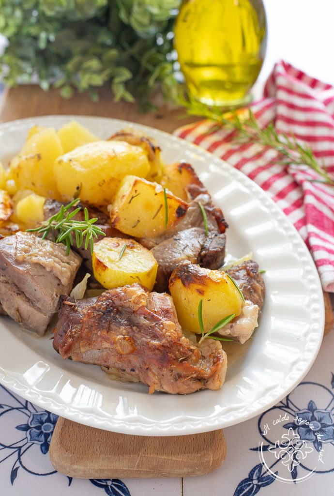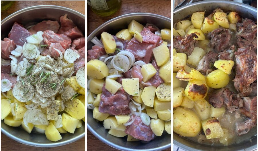 Placez la viande dans un plat et ajoutez les pommes de terre épluchées, rincées et coupées en gros morceaux. Ajoutez l’oignon émincé, l’huile, le vin, le sel et les aromates (poivre, romarin, ail, laurier, sauge),