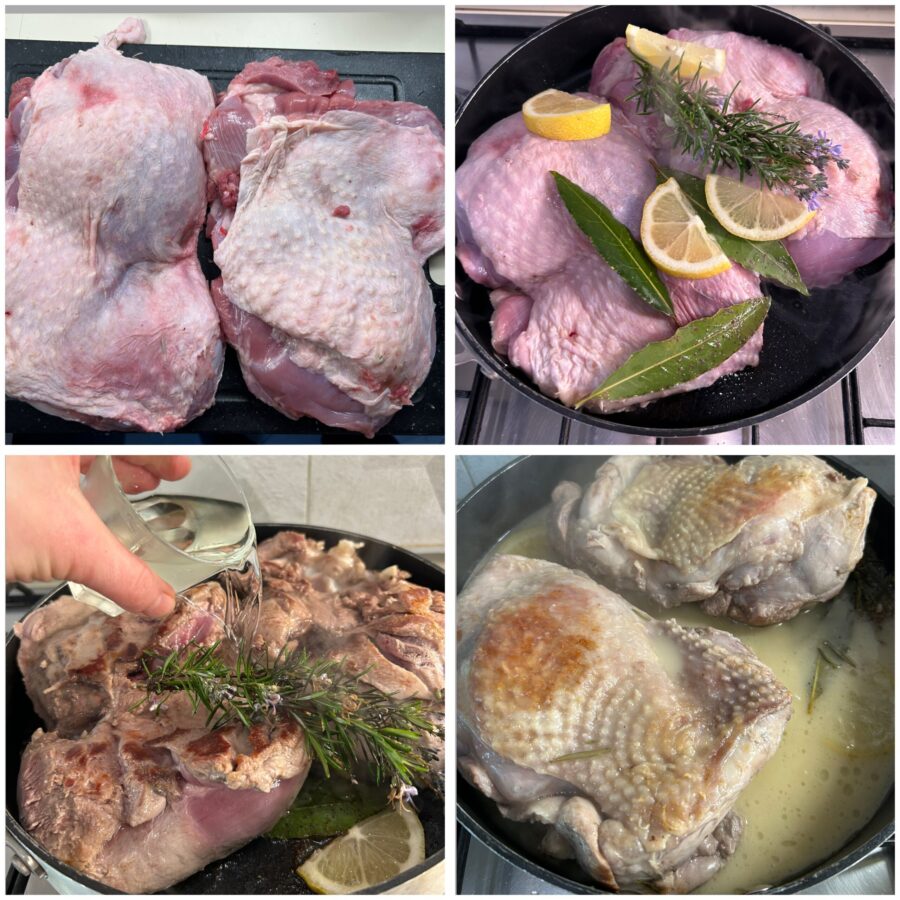 • Enlevez les éventuelles plumes restantes de la dinde, versez un filet d’huile dans la poêle et déposez-y la viande. Ajoutez un demi‑citron coupé en tranches et son jus, sel, poivre, romarin et laurier. Laissez revenir à feu vif et, une fois la viande bien dorée, retournez-la pour faire dorer l’autre côté. Déglacez avec le vin blanc et, une fois l’alcool évaporé (vous le sentirez à l’odeur), posez le couvercle sur la casserole, baissez le feu et laissez cuire très doucement pendant une heure.
