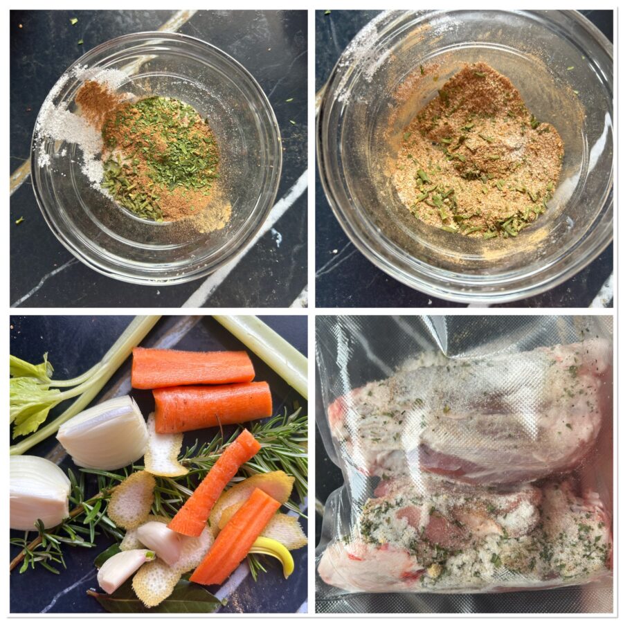 Commencez par préparer le mélange d’épices : dans un bol, réunissez le sel (calculé en fonction du poids de la viande), le poivre, la paprika et la ciboulette, ainsi qu’un hachis de romarin. Mélangez bien jusqu’à obtenir un mélange parfumé et homogène. Frottez les jarrets avec ce mélange aromatique, en le répartissant sur toute la surface : cette étape sert à donner du goût dès le départ et aidera à obtenir un jarret de porc sous vide bien équilibré.