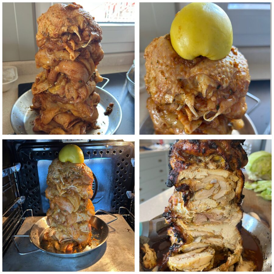 • Une fois le temps de repos écoulé, commencez à composer votre kebab. Disposez les morceaux de poulet les uns sur les autres, en les pressant bien avec les mains pour obtenir une tour compacte et uniforme. Fixez-les en enfilant une broche au centre, en l’ancrant à la base de la marmite ou en utilisant un support qui maintiendra la structure stable pendant la cuisson.