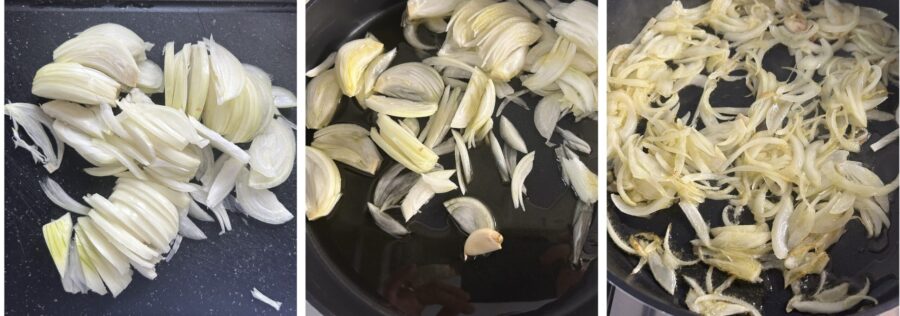 Émincez l’oignon, mettez-le dans une grande poêle avec deux gousses d’ail, ajoutez un généreux filet d’huile et laissez-le fondre.