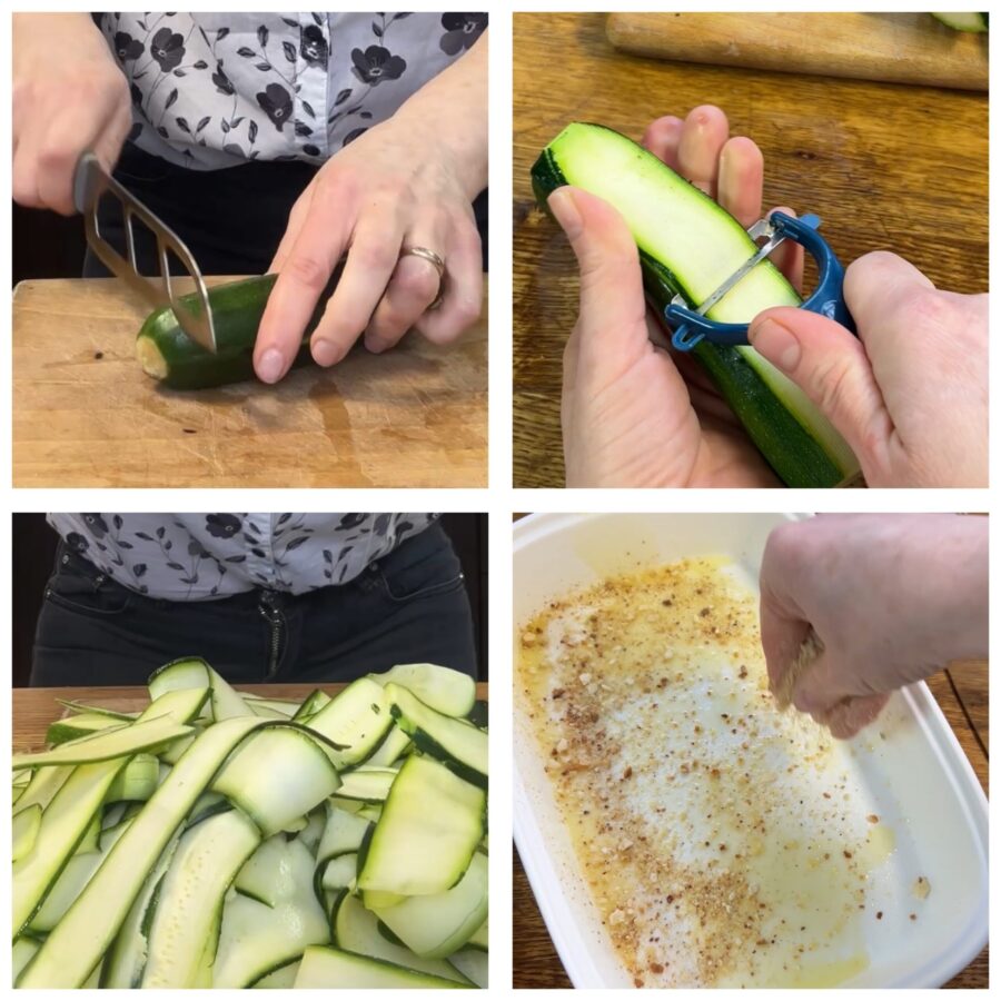 Lavez les courgettes, retirez les extrémités et tranchez-les très finement avec une mandoline ou un économe.
