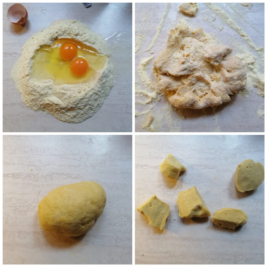 Comme je vous le disais plus haut, je prépare la pâte uniquement avec de la semoule remoulue pour un résultat plus « costaud » et résistant à la cuisson. C’était aussi la façon dont ma grand-mère la faisait, mais vous pouvez décider de faire une pâte traditionnelle en utilisant seulement de la farine 00 ou choisir un compromis et faire moitié semoule, moitié farine 00, pour obtenir une pâte rustique mais plus légère. Quant à l’eau, ajoutez-la seulement si elle est vraiment nécessaire et que la farine en réclame, car sinon la pâte devient intravaillable. Ci‑dessous vous trouverez les trois versions : habituellement la pâte avec uniquement de la farine 00 ne demande pas d’ajout d’eau, tandis que la semoule, étant plutôt « sèche », en demandera un peu.