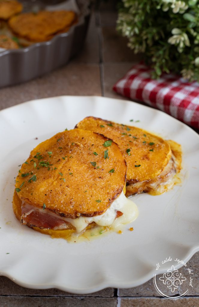 Médaillons de courge au speck et au fromage, cuits au four, la recette automnale rapide et gourmande pour un plat principal super simple, économique et savoureux, ou pour un apéro original. Si vous aimez les recettes à base de courge, mais manquez d’inspiration et ne savez pas comment la cuisiner, c’est le plat rapide et savoureux qui vous sauve le dîner. Les tranches de courge d’environ un demi-centimètre sont cuites au four quelques minutes, puis garnies de speck et de fromage (provola, caciotta, scamorza…) et laissées à dorer encore un peu au four. Ces médaillons, aussi bons que les célèbres Cotolette di zucca al forno, se préparent en peu de temps, sont très faciles à réaliser et peuvent aussi être cuits en friteuse sans huile. Allons en cuisine maintenant, mais avant je vous rappelle que si vous voulez rester informés de toutes mes recettes, vous pouvez suivre ma page Facebook (ici) et mon profil Instagram (ici).