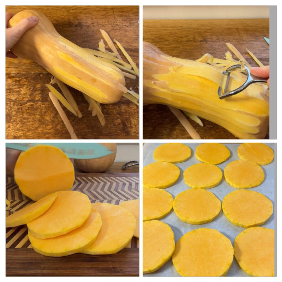 Pour faire les médaillons de courge, commencez par la peler, puis tranchez-la pour obtenir environ 10-12 tranches d’environ 0,5 cm d’épaisseur, ou un peu moins.