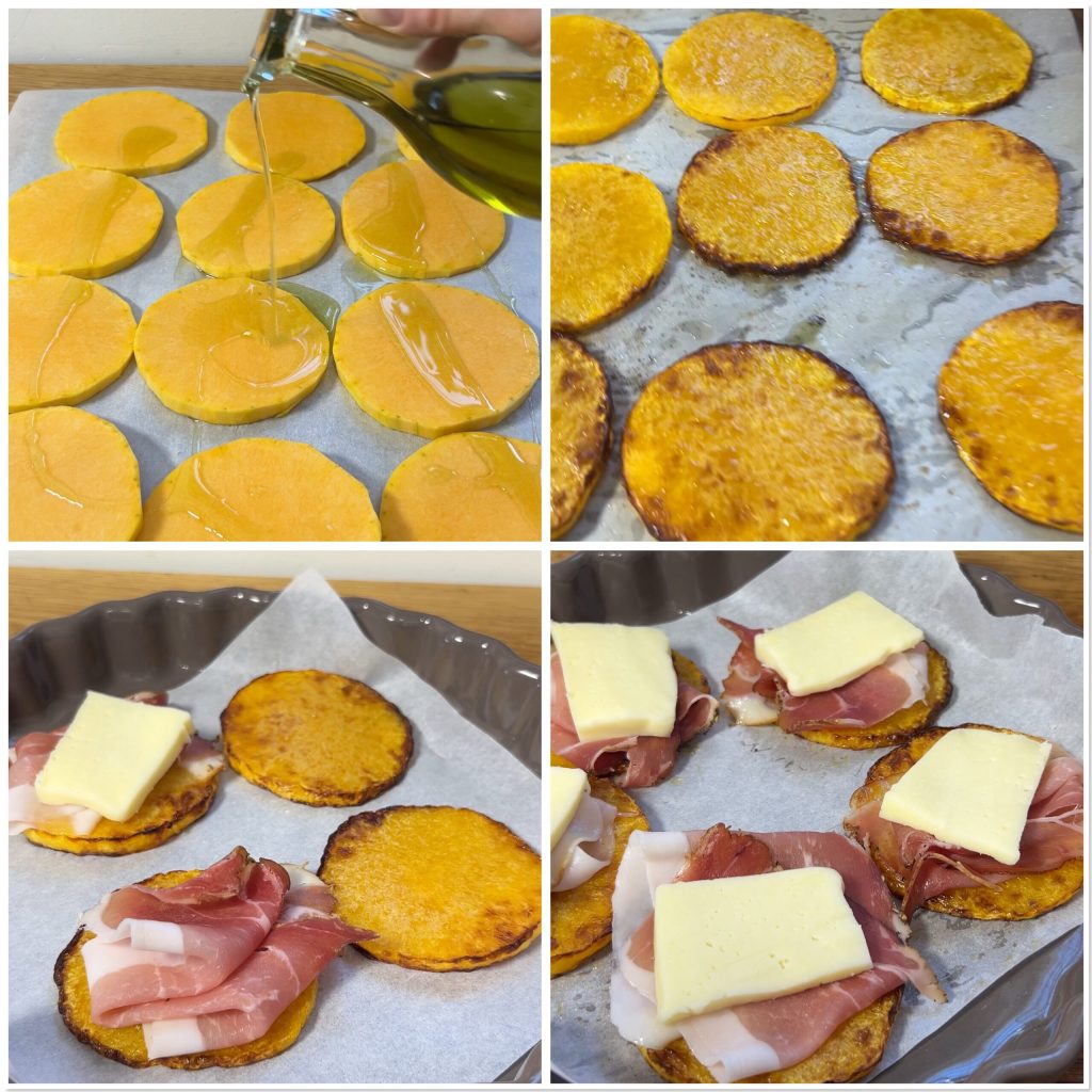 Garnissez d’une tranche de speck et d’une tranche de fromage, puis recouvrez chaque disque de courge avec une autre tranche de courge.