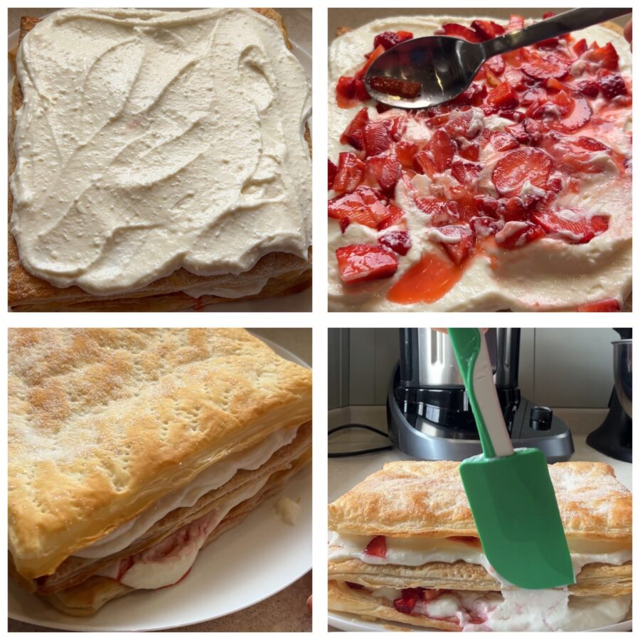 • Couvrez avec une autre couche de pâte, puis une de crème et une de fraises.