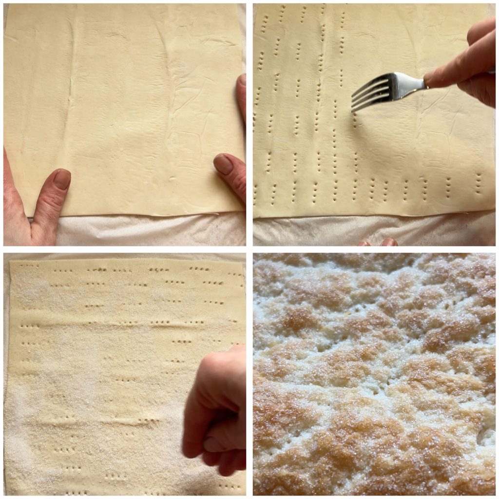 Pour cette recette j’ai utilisé trois rouleaux de pâte feuilletée prête ; j’ai choisi la forme ronde dont j’ai découpé 3 carrés d’environ 26 cm de côté. Vous pouvez bien sûr utiliser la version rectangulaire. J’ai récupéré les chutes, les saupoudrant de sucre et en les faisant cuire au four, obtenant des snacks très gourmands et légers.