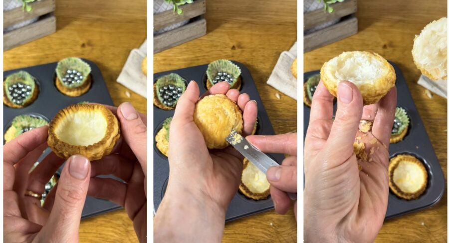 Faites cuire dans un four statique préchauffé à 200°C pendant 15 minutes ou jusqu’à ce qu’ils soient dorés. Si vous n’avez pas de billes en céramique ou en acier, la pâte gonflera à la cuisson, vous devrez alors la creuser à l’aide d’un couteau (voir photo).