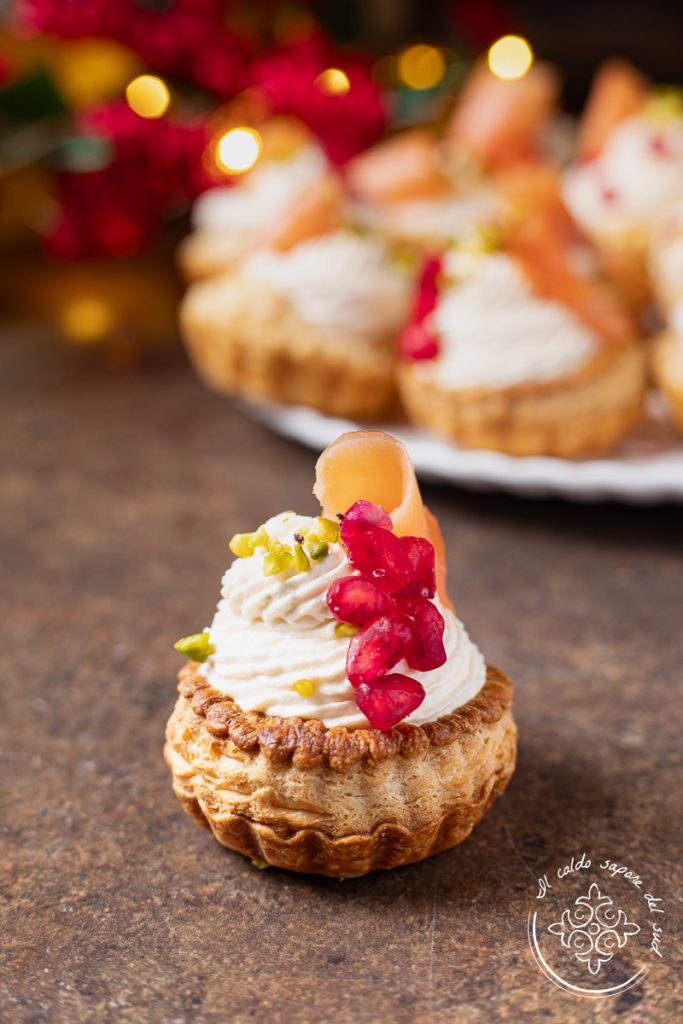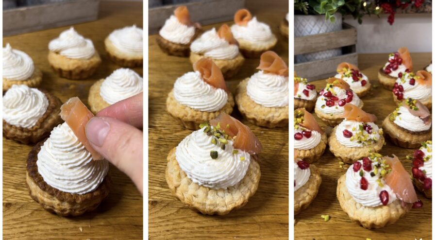 Nids de pâte feuilletée à la mousse de saumon. Si vous cherchez une entrée spectaculaire et gourmande à préparer la veille et parfaite pour votre menu de fêtes à base de poisson, ces nids de pâte feuilletée à la mousse de saumon sont l’idée qu’il vous faut. Ce sont de petites bouchées individuelles garnies d’une crème au saumon et décorées de pistaches concassées et de grains de grenade, qui apporteront couleur, goût et gaieté à votre table, comme la Guirlande de Noël en pâte feuilletée ou le Bavarois salé au saumon. Allons en cuisine, la simplicité et la gourmandise de ces entrées de Noël rapides vont vous surprendre, mais avant tout je vous rappelle que si vous voulez rester informé de toutes mes recettes, vous pouvez suivre ma page Facebook (ici) et mon profil Instagram (ici).