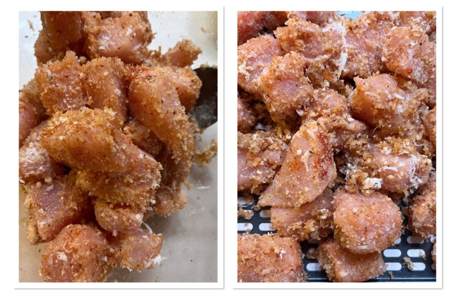 • Coupez la poitrine de poulet en morceaux, mettez-les dans un bol, ajoutez un bon filet d’huile, la chapelure, les épices et le fromage, mélangez le tout avec une cuillère et disposez dans le panier de la friteuse.