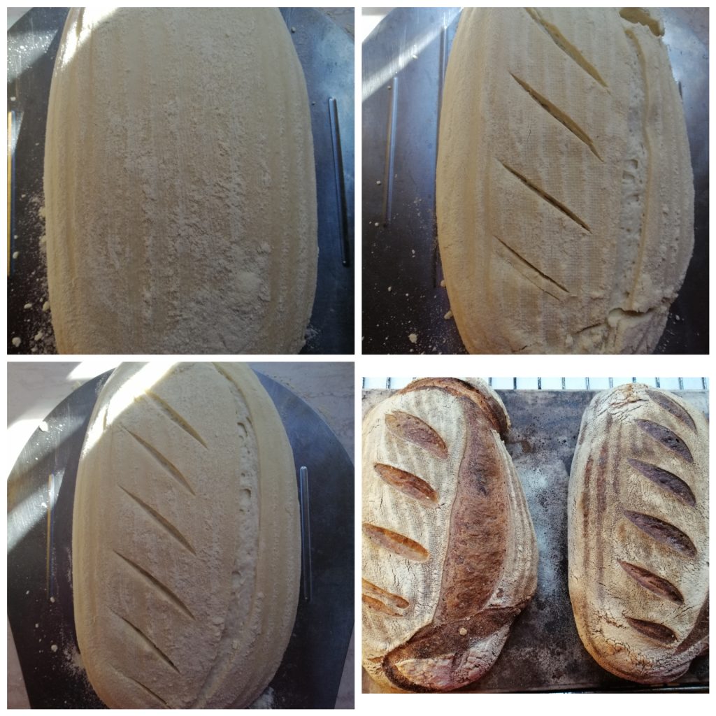 (Du moment où vous retournez le pain sur la pelle jusqu’à l’enfournement, vous devez être très rapides pour éviter qu’il ne s’aplatisse trop.)