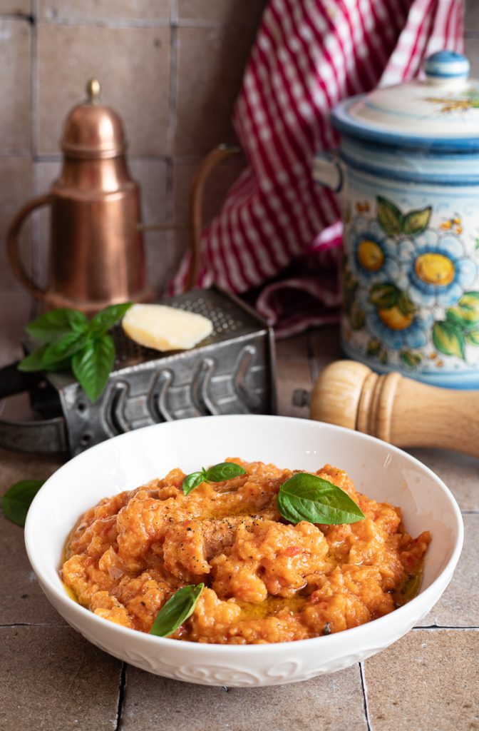 À la fin de la cuisson laissez reposer quelques minutes et dressez les assiettes, ajoutez un bon filet d’huile, du sel, du poivre et du fromage râpé (vous pouvez en ajouter un peu aussi en fin de cuisson, juste avant de retirer du feu) et servez. Si c’est la saison, ajoutez aussi quelques feuilles de basilic.