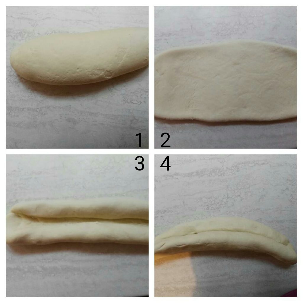 Pour former la miche allongée, mettez de côté environ 50/70 g de pâte, étalez le plus grand cylindre en lui donnant une forme ovale, roulez les côtés les plus longs vers le centre, d’abord d’un côté puis de l’autre, pressez légèrement les deux parties roulées et donnez-lui une forme de demi-lune (voir photo étape 4).