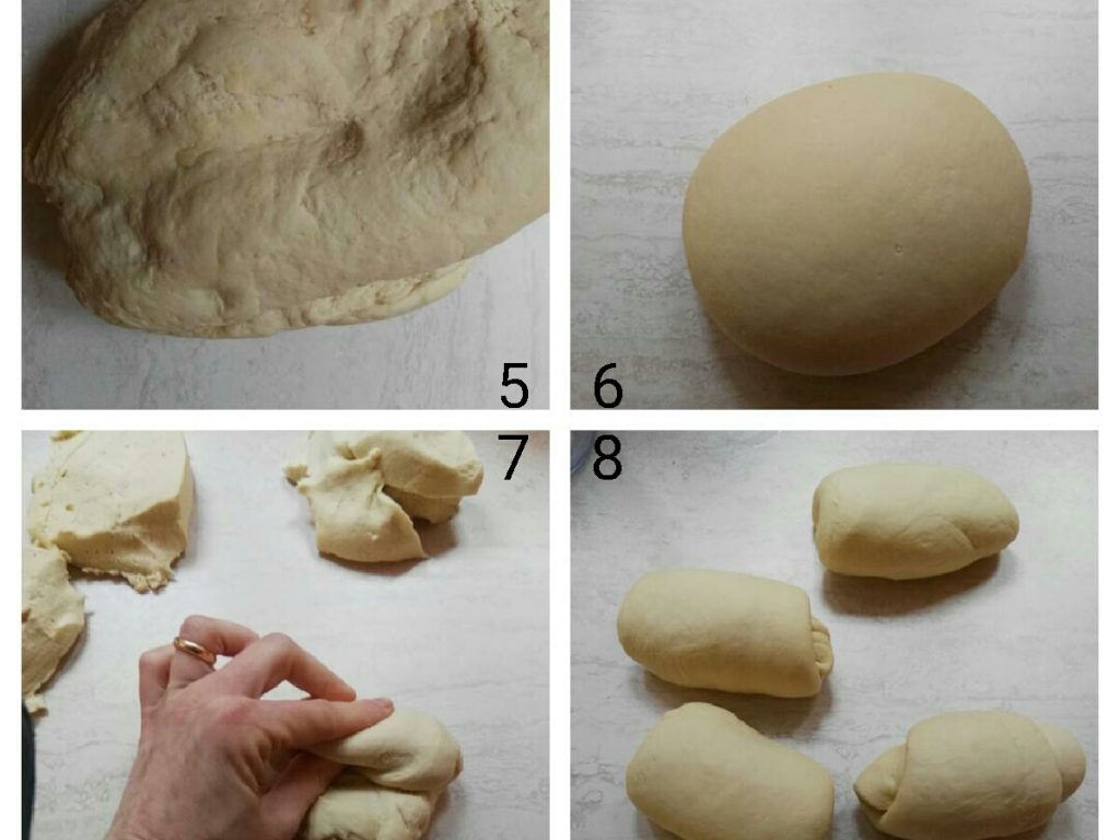 Une fois la pâte obtenue, divisez-la : j’ai fait 5 petits pains de 250 g et avec le reste j’ai fait un pain plus grand. Essayez de travailler les morceaux pour obtenir des cylindres.