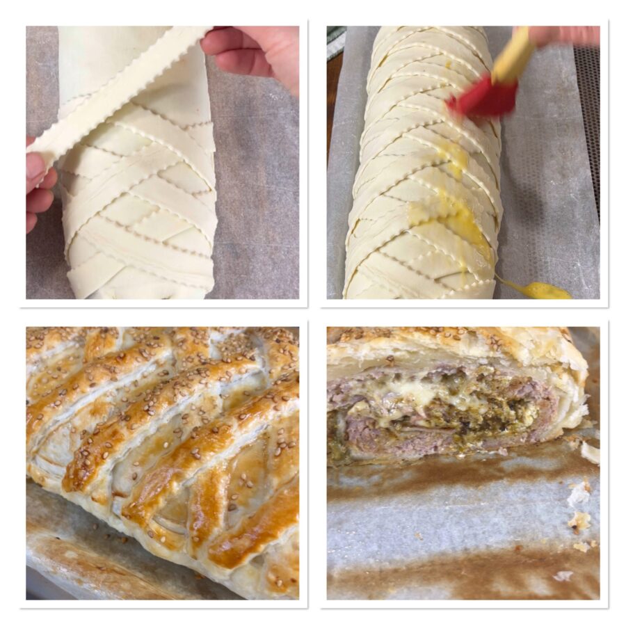 • Utilisez la pâte restante pour réaliser la décoration finale : coupez-la en bandes et réalisez une tresse sur la surface du pain de viande.
