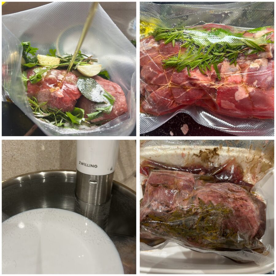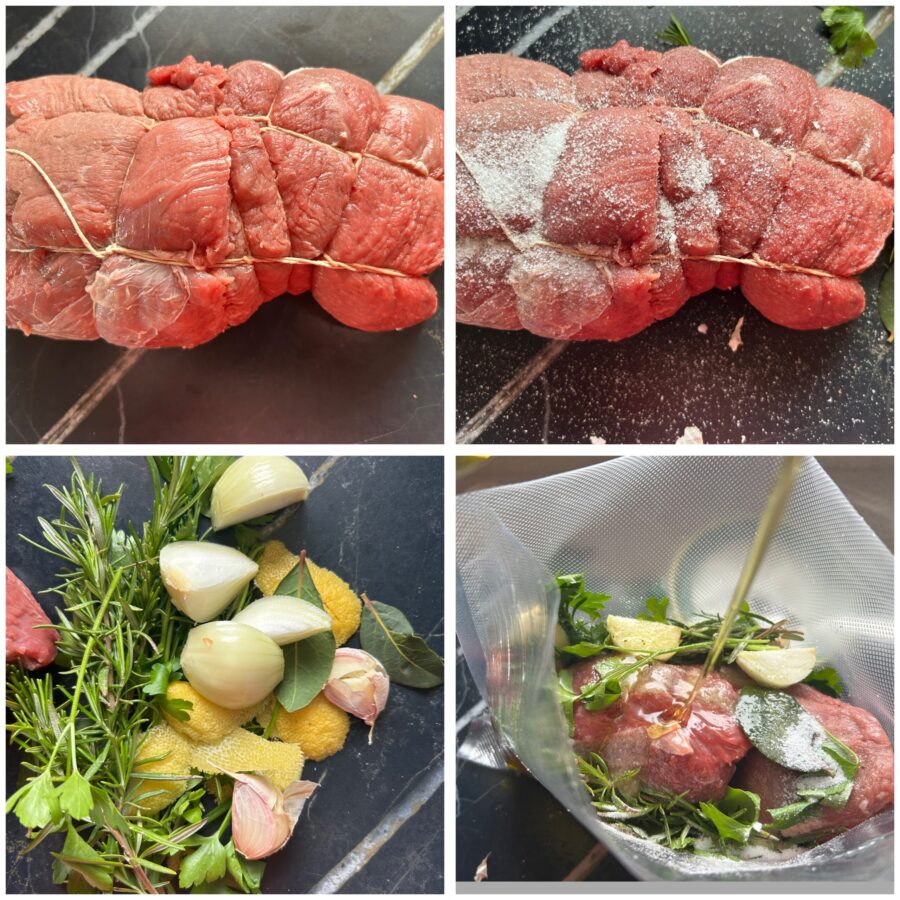 Préparez ensuite les aromates : disposez sur le plan de travail romarin, laurier, persil, gousses d’ail, oignon et quelques zestes de citron, qui apporteront de la fraîcheur sans masquer le goût de la viande. Mettez le tout dans le sac sous vide avec la viande, ajoutez un filet d’huile d’olive extra vierge et terminez par une pincée de poivre, le sucre et le reste du sel. L’huile, un peu généreuse, nous aidera à obtenir une viande encore plus moelleuse et succulente.