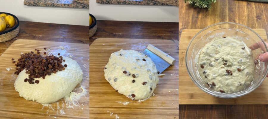 • Lorsque toute l’huile est absorbée et que vous obtenez une pâte sèche et élastique, ajoutez les raisins secs et incorporez-les (je ne les réhydrate pas car trop humides je n’aime pas, mais si vous préférez vous pouvez les tremper une dizaine de minutes avant utilisation). Pétrissez en formant une boule avec le racloir et placez la pâte de nouveau dans le bol au chaud pendant 20 minutes.