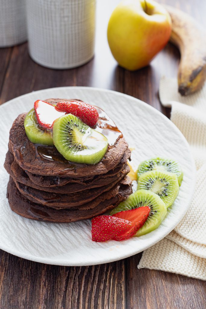 Sans œufs, sans beurre, sans huile ni sucre, uniquement avec des bananes bien mûres, des pommes et de la farine, ces pancakes légers au cacao vous offriront un petit-déjeuner sain et satisfaisant sans renoncer au goût.