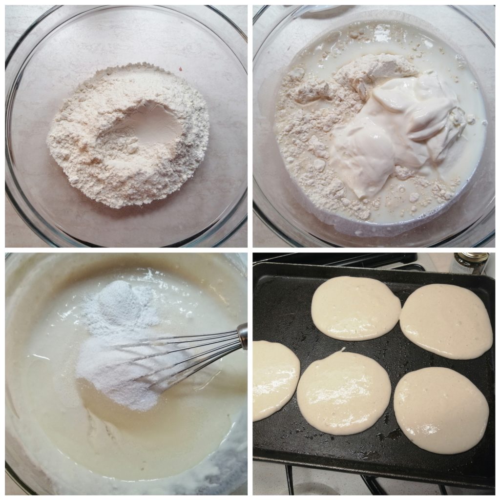 • Pour préparer ces pancakes sans beurre, moelleux et légers, versez la farine dans un bol, ajoutez le yaourt et la moitié du lait, mélangez puis ajustez la pâte avec le reste du lait.