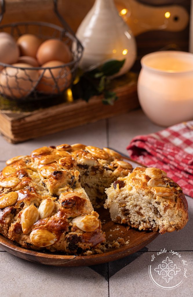 Formez la pâte avec l’aide d’une spatule (tarocco) et un peu de farine, aplatissez pour obtenir une miche un peu basse. Badigeonnez avec l’œuf, recouvrez la surface avec les amandes et badigeonnez-les elles aussi avec le jaune.