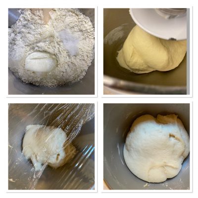 Détachez la pâte du crochet, couvrez et laissez lever dans le four avec la lumière allumée jusqu’à ce qu’elle double de volume, cela prendra environ 2 heures.