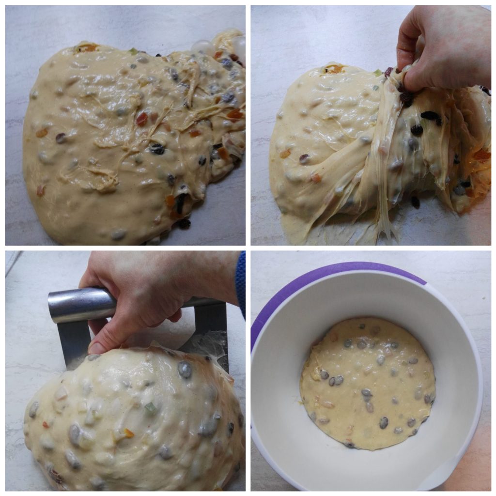 • Divisez la pâte, façonnez-la en boules, faites-la pointer encore quinze minutes puis répétez la pirlatura ; pour ma part j’ai fait deux panettones de 1/2 kg.