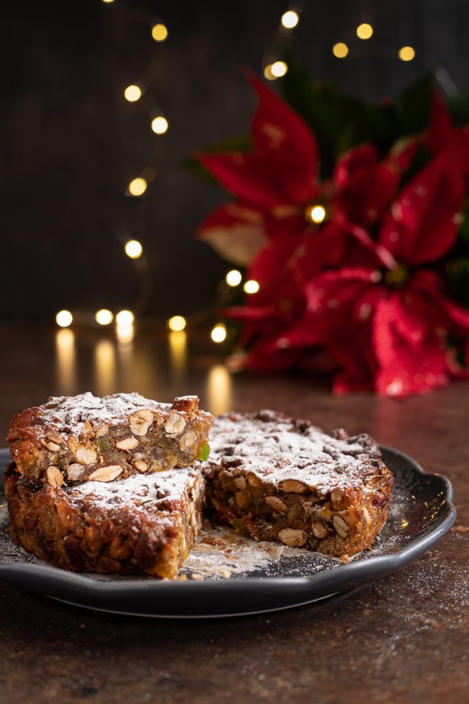 Servez le gâteau à température ambiante et conservez-le dans un endroit frais et sec, sous une cloche en verre, pendant environ un mois.