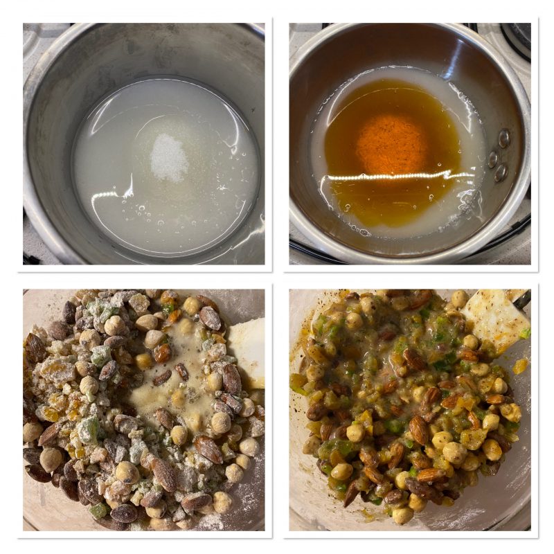 Dans un bol, rassemblez les fruits confits coupés en petits dés et ajoutez les épices.