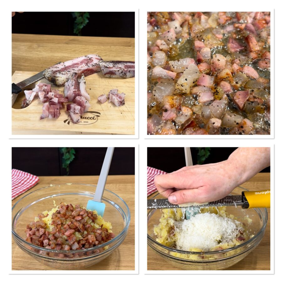 Coupez le guanciale en petits dés, mettez-les dans une poêle et laissez-les rissoler à feu très doux dans leur propre graisse jusqu’à ce qu’ils soient dorés. Ajoutez-les aux pommes de terre écrasées sans enlever la graisse, puis incorporez le fromage râpé. Mélangez, ajoutez un œuf et mélangez encore. Ne salez pas.