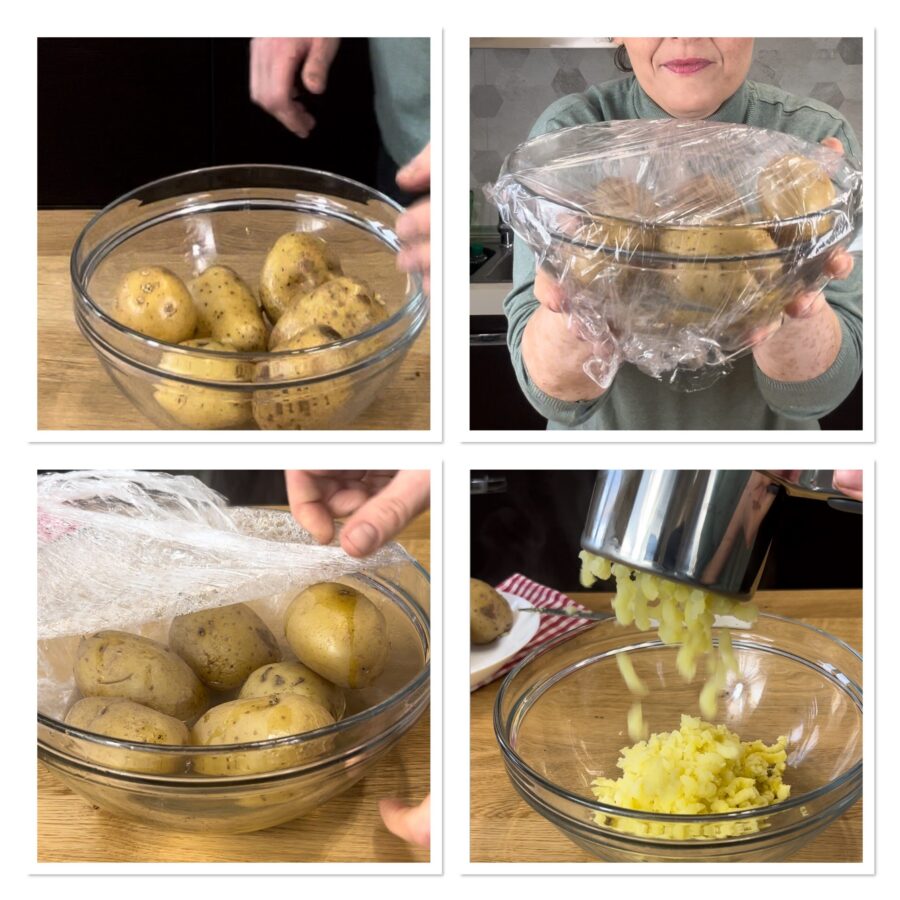 Faites cuire les pommes de terre : vous pouvez les faire bouillir 35-40 minutes dans de l’eau bouillante, ou jusqu’à ce qu’en les piquant à la fourchette elles soient tendres, ou bien les cuire à la vapeur pendant 20 minutes au micro-ondes dans un bol couvert de film étirable ou dans une vapeur cuiseur.