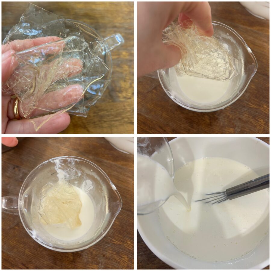 Essorez délicatement la gélatine et dissolvez-la dans la crème chaude, en remuant avec soin jusqu’à complète dissolution.