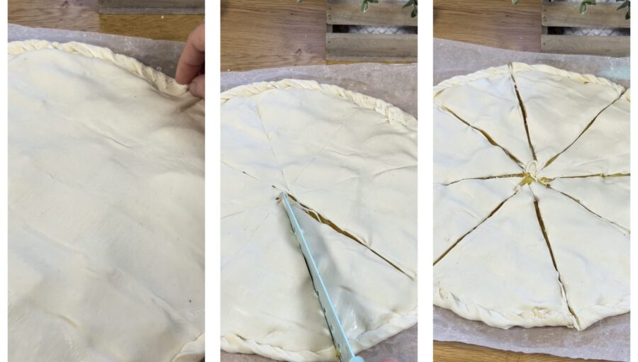 Repliez les bords en scellant la pâte et, avec un couteau bien aiguisé, entaillez pour former des parts.