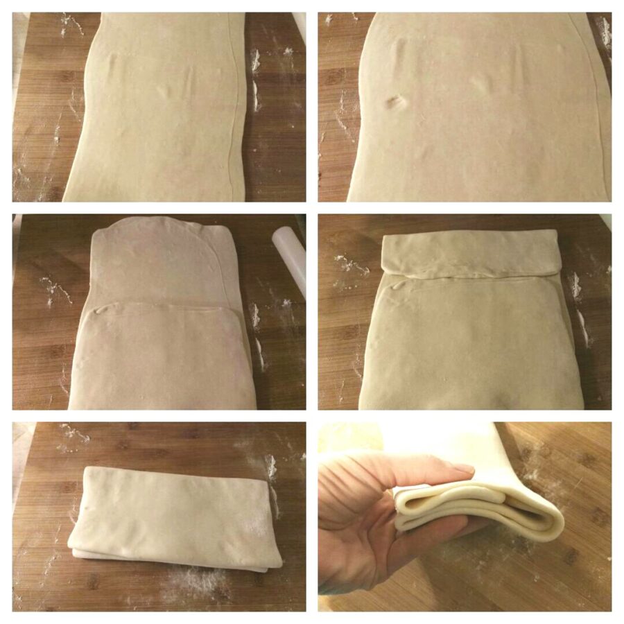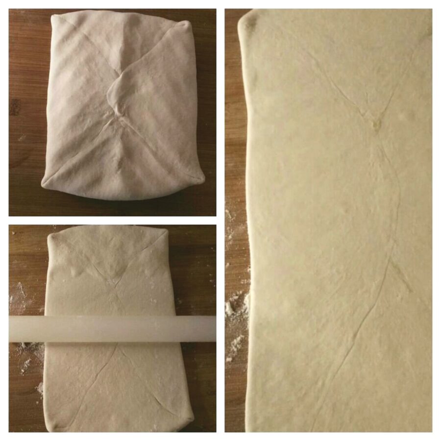 Une fois les séries de tours terminées, vous aurez formé le feuilletage. Pendant toute la manipulation, pensez à utiliser toujours un peu de farine pour éviter que la pâte n’accroche ou se déchire : les diverses couches doivent rester intactes pour une bonne levée et un beau feuilletage.