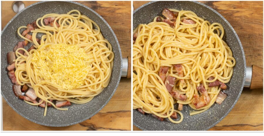 • Une fois ces étapes réalisées, égouttez les pâtes al dente en réservant un peu d’eau de cuisson, versez-les dans la poêle avec le guanciale rissolé, ajoutez la crème d’œufs et mélangez à feu très doux jusqu’à obtenir une consistance crémeuse, sans trop cuire : il faut éviter que l’œuf ne coagule. Si nécessaire, ajoutez un peu d’eau de cuisson.