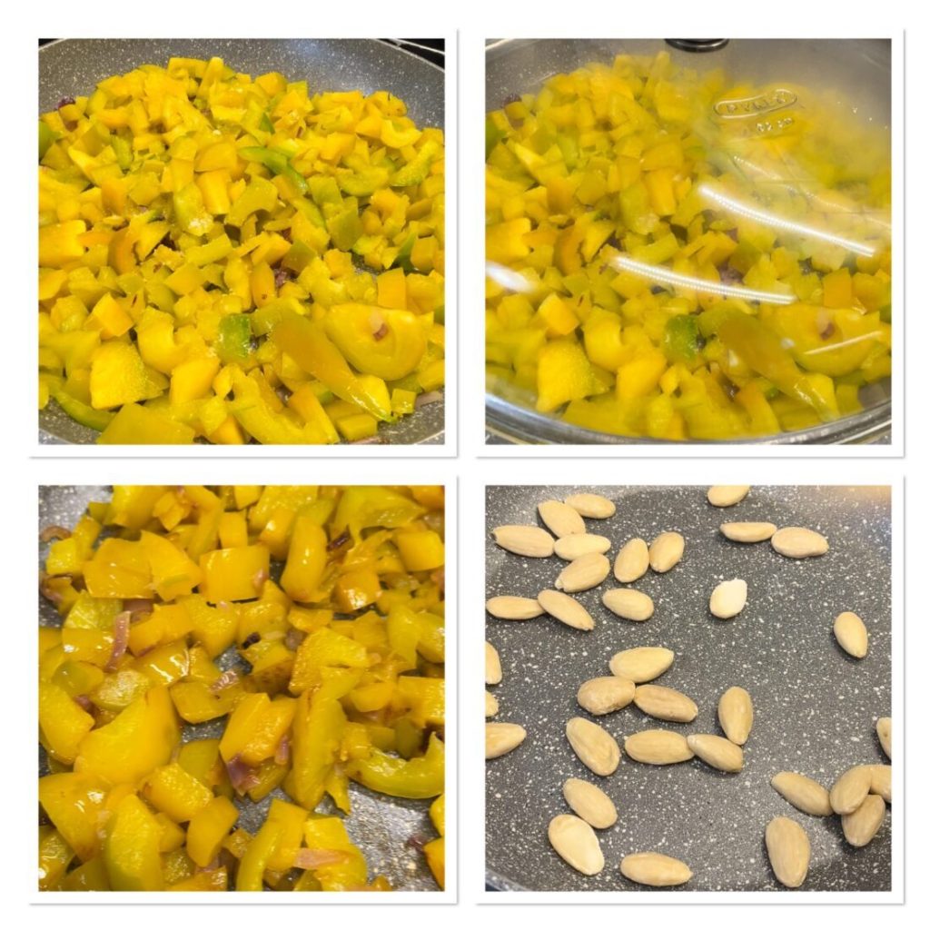Rincez les poivrons ; vous pouvez utiliser des jaunes, des rouges ou les deux : les jaunes ont une saveur plus douce et délicate. Coupez-les en deux, retirez le pédoncule, les graines et les filaments, coupez-les en lanières puis en dés. Faites revenir l’oignon dans l’huile d’olive, ajoutez les poivrons, salez et laissez mijoter à feu moyen pendant 20 minutes.