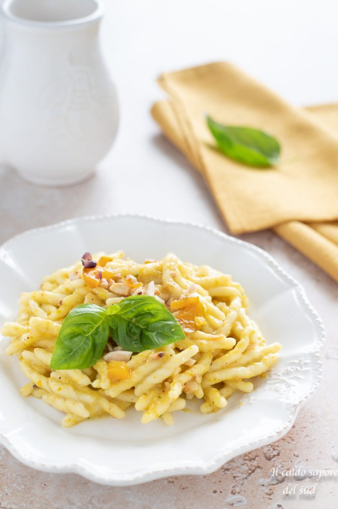 Versez les trofie dans la poêle où vous avez cuit les poivrons, ajoutez la crème et deux louches d’eau de cuisson, laissez sur feu vif jusqu’à obtenir un plat bien crémeux.