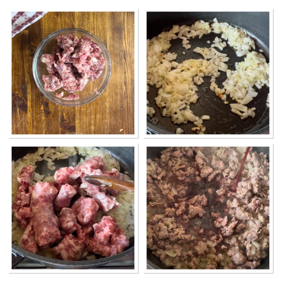 Épluchez l’oignon, hachez-le et faites-le revenir dans un peu d’huile d’olive. Enlevez la peau de la saucisse et émiettez-la,