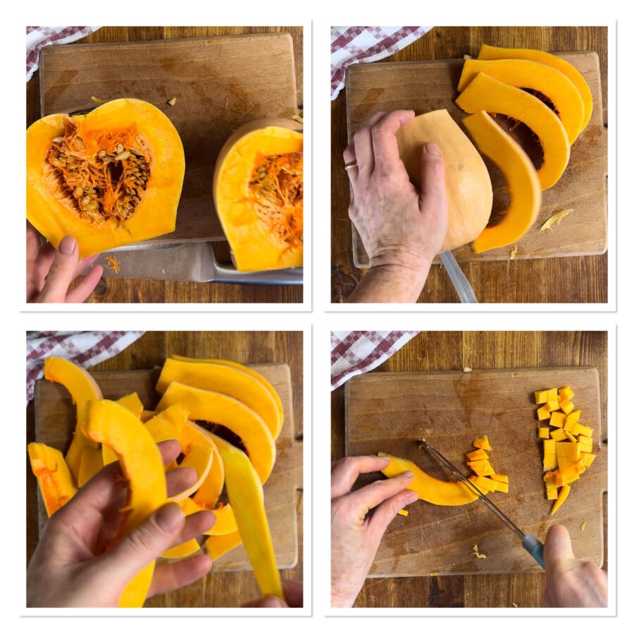 Rincez la courge, prélevez-en une partie, ôtez les graines et les filaments et tranchez-la. Ensuite enlevez la peau des tranches, cela rendra la procédure plus simple. Coupez les tranches de courge en petits dés.