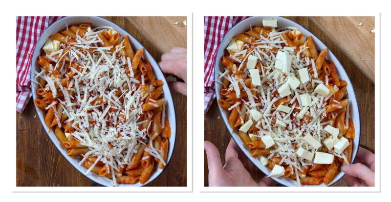 Versez la moitié des pâtes dans un plat à gratin, ajoutez quelques dés de mozzarella, recouvrez avec le reste des pâtes, saupoudrez de parmesan et ajoutez encore quelques dés de mozzarella.