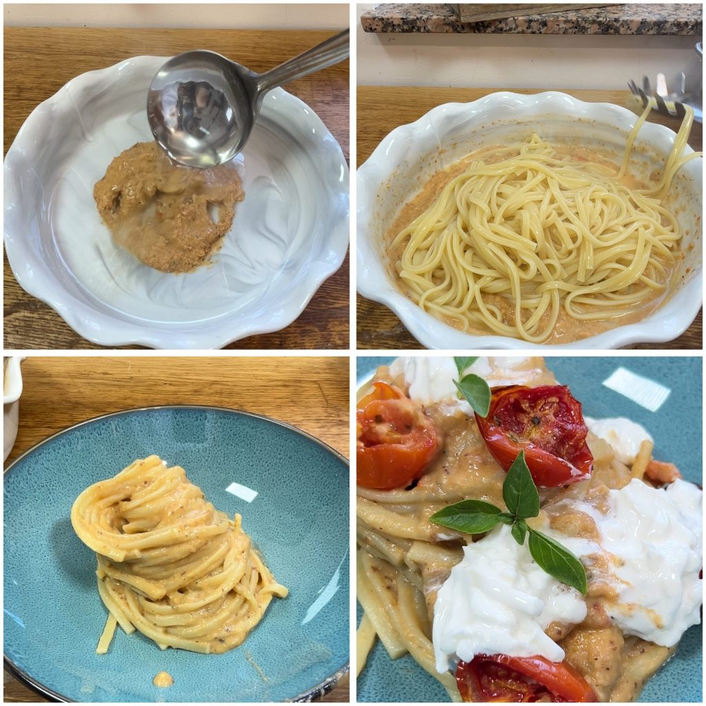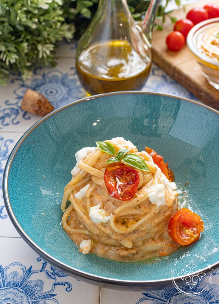 Pâtes au pesto d’aubergines, aux amandes et tomates confites, avec de la burrata. C’est l’un de ces plats de pâtes aux aubergines qui ne doit absolument pas manquer dans notre collection de recettes d’été aux aubergines et l’un de ces plats qui font toujours leur petit effet à table. Nous avons déjà parlé du pesto d’aubergines et tomates, tout comme du pesto d’aubergines et basilic, deux recettes qui font partie de notre collection dédiée aux pestos maison, mais cette fois je ne voulais pas faire de simples pâtes, je voulais quelque chose d’encore plus gourmand et savoureux : j’ai donc ajouté de la burrata. Le résultat est ces pâtes crémeuses au pesto d’aubergines qui ont fait craquer toute ma famille ! Prêts à les préparer vous aussi ? Allons-y, mais d’abord je vous rappelle que si vous voulez rester informés de toutes mes recettes vous pouvez suivre ma page Facebook (ici) et mon profil Instagram (ici).