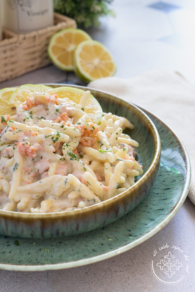Pâtes au saumon fumé et au citron, crémeuses, très faciles et rapides à préparer. J’adore les recettes avec du saumon fumé, que ce soit une mousse de saumon fumé, une salade de pâtes froide courgettes et saumon ou de simples roulés de courgettes à la robiola et saumon, je ne sais jamais dire non au saumon fumé ! Il y a quelques jours, je l’ai trouvé en promotion au supermarché alors j’en ai pris plusieurs paquets : avec l’un j’ai préparé les pâtes au saumon fumé et tomates cerises, puis j’ai réalisé aussi des avocado toast au saumon fumé et pain de campagne et enfin un roulé d’omelette au saumon et roquette. Avec le dernier paquet, j’ai préparé l’un des plats préférés de mon fils : les pâtes au saumon, crème et citron. Pour ce plat gourmand j’ai choisi un format de pâte fraîche, en particulier les trofie, dont j’adore la texture, mais vous pouvez choisir le format que vous préférez, comme des busiate ou des maccheroni, ou même des pâtes sèches classiques.