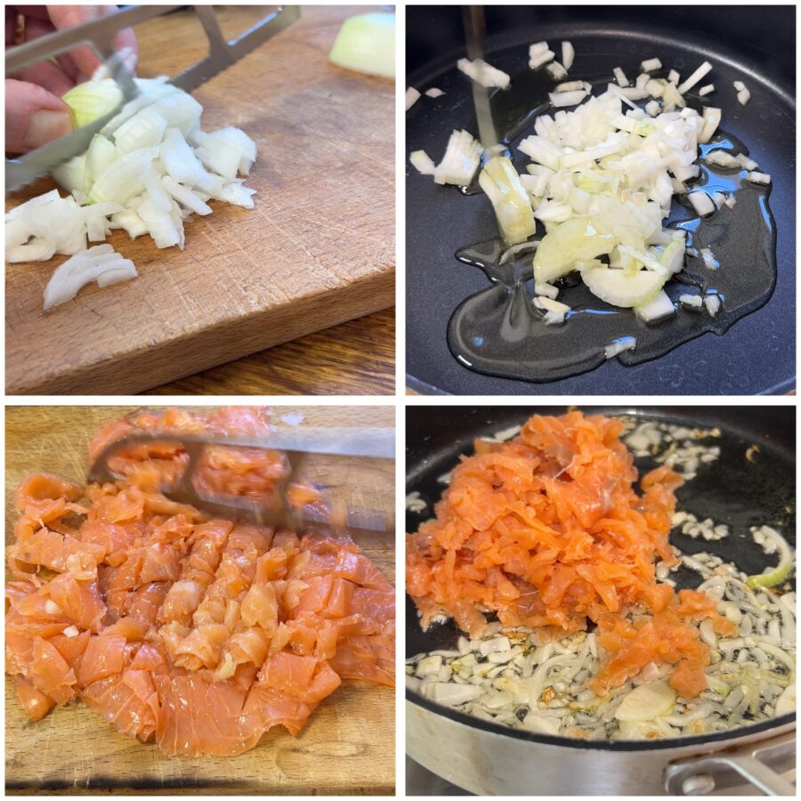 • Pour préparer les pâtes au saumon fumé, crème et citron, épluchez et hachez l’oignon, faites-le revenir dans un généreux filet d’huile et laissez-le s’attendrir. Ajoutez le saumon fumé coupé en petits morceaux.