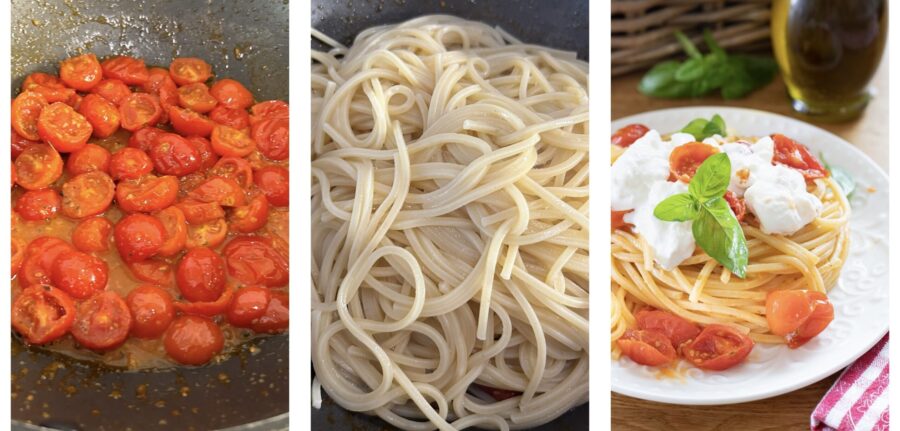 Faites cuire les pâtes et égouttez-les al dente, puis ajoutez-les aux tomates cerises avec un peu d’eau de cuisson et mélangez à feu vif. Dressez et répartissez la stracciatella dessus, garnissez de basilic frais et servez.