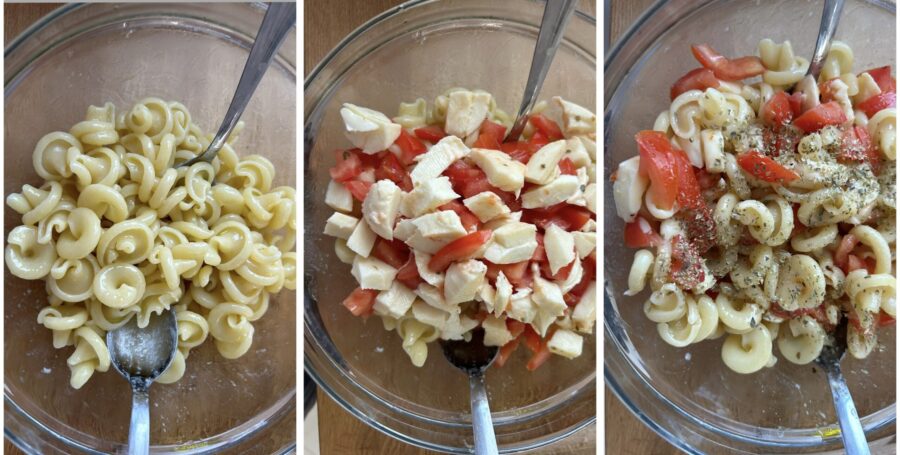 Faites cuire les pâtes, égouttez-les al dente et assaisonnez-les d’un bon filet d’huile. Laissez-les refroidir ou tiédir puis ajoutez la garniture. Mélangez et terminez avec encore un peu d’origan et du basilic, servez tiède ou à température ambiante.