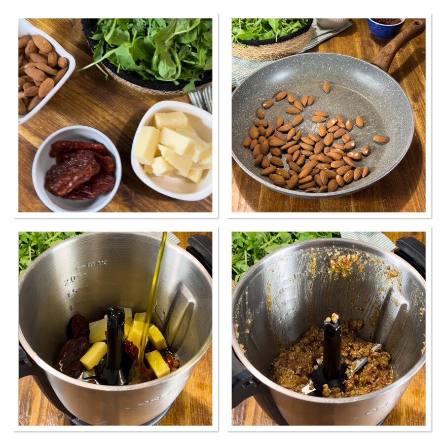 Pour préparer le pesto, commencez par faire revenir les amandes à la poêle pour qu’elles grillent un peu et prennent de la couleur. Laissez-les refroidir et placez-les dans le bol du mixeur avec les tomates séchées, le fromage et l’huile, mixez autant que possible.