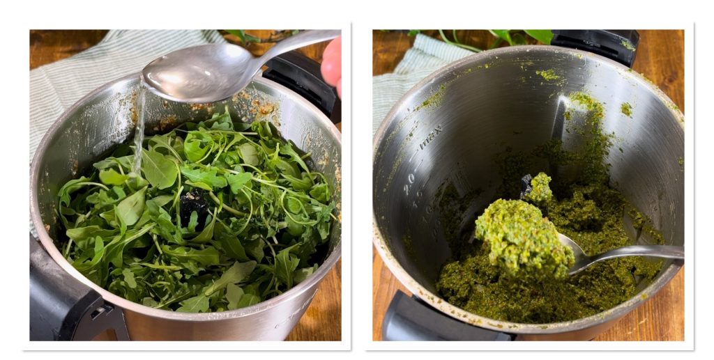 Si le mélange s’est réchauffé, laissez-le refroidir avant de ajouter la roquette et une cuillère de vinaigre (qui ralentira l’oxydation de la roquette), mixez encore jusqu’à obtenir une sauce homogène.