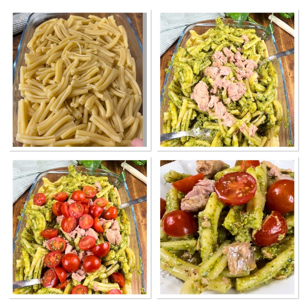 Le pesto est prêt, mélangez-le aux pâtes avec le thon égoutté et les tomates cerises rincées et coupées en deux, mélangez et dégustez.