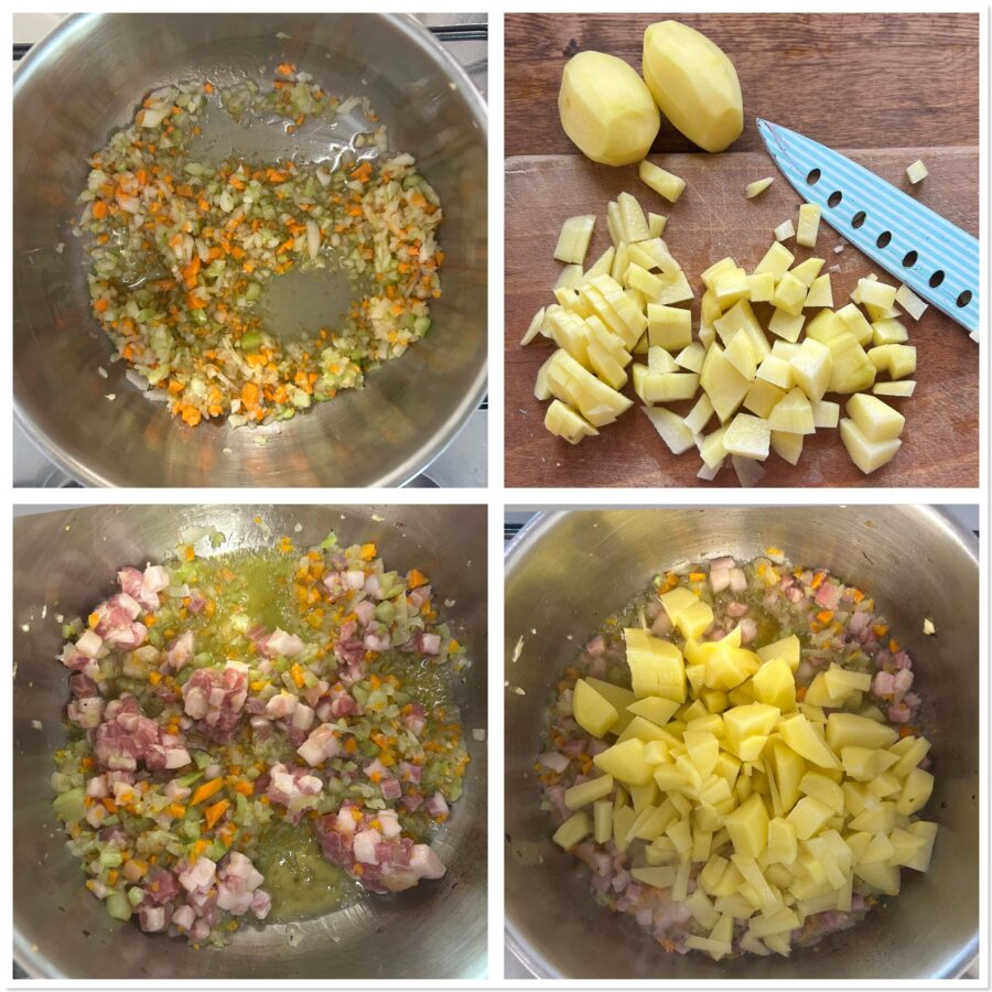 Ajoutez la pancetta et, une fois qu’elle est légèrement blanchie, incorporez les pommes de terre pelées, rincées et coupées en morceaux de tailles variées.